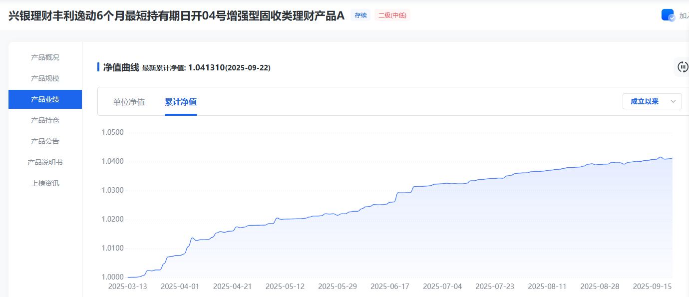 该产品为主动管理固定收益类理财,资产配置以债权类资产为主,灵活运用利率套保、权益增强等多元策略。产品自成立以来,虽经历债市调整,但凭借稳健运作,累计净值实现了稳步提升。兴银理财“丰利逸动6个月最短持有期日开04号增强型A”为兴银理财丰利逸动微含权系列旗下产品。