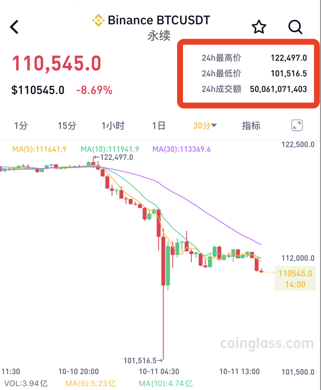 作为市值龙头的比特币,从12.2万美元高位快速下探至10.15万美元低点。截至发稿,最新报价110545美元/枚,24小时跌幅超17%,成交额超500亿美元;