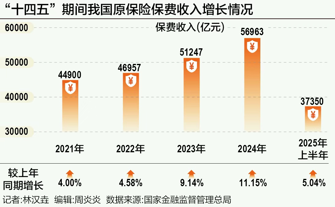 国家金融监管总局数据显示,2021—2024年我国原保险保费收入分别达44900亿元、46957亿元、51247亿元、56963亿元,同比增速从4.0%逐步提升至11.15%,分别为4.0%、4.58%、9.14%、11.15%;2025年上半年,保险业保费收入延续增长势头,合计达37350亿元,较2024年同期增长5.04%。
