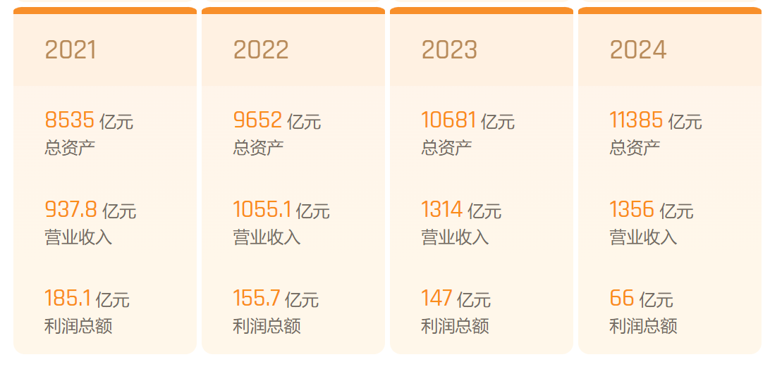 数据显示,越秀集团正面临着盈利增长压力。2021年至2024年间,其营业收入持续增长,到2024年已达1356亿元,但利润总额却出现明显下滑,2024年仅为66亿元,仅为2021年的1/3。